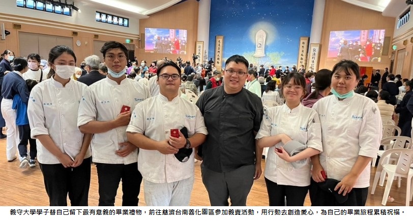 義守大學「觀光餐旅學院」廚藝暨美食學學系大四學生,在畢業前為了替自己留下一個最有意義的畢業禮物,他們前往慈濟台南善化園區參加義賣活動。團隊成員有本國籍學生以及越南、印尼籍的學生,他們以異國健康蔬食料理為主要販售美食,推出越式春捲、印尼沙嗲串、法式菌菇濃湯、原住民竹筒飯和墨西哥捲餅等,在活動現場大展廚藝,美味料理大受好評。