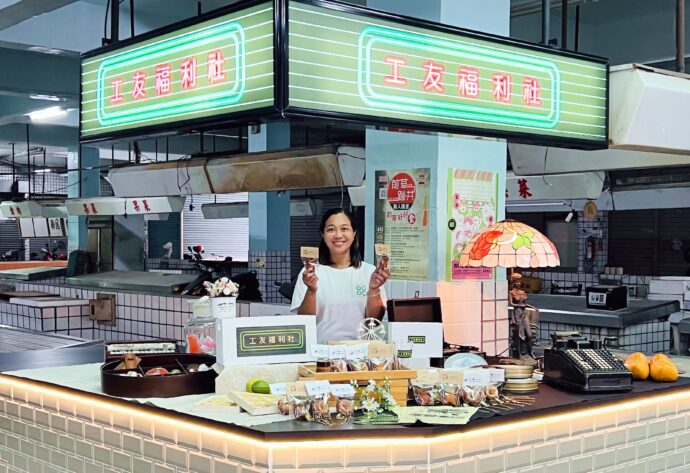 青創攤商「工友福利社」老闆李雅婷為前鎮草衙導覽員,跟遊客走讀到市場時感觸良多,常串連里民在市場舉辦活動。為進一步活絡市場,決定進駐市場成立工友福利社,串連在地裁縫攤商提供講古物、穿古著等服務,以實作古著新穿搭的概念,導流更多青年來識傳統市場。