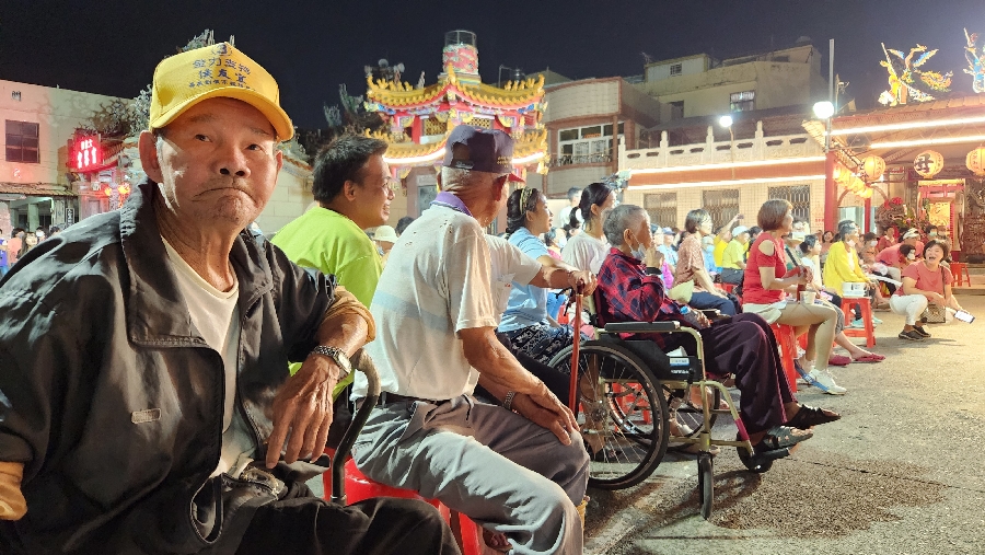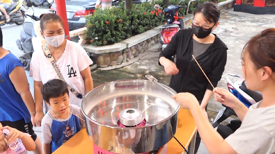 夜晚的廟埕越來越熱鬧,這是連續舉辦6年的朴子藝文下鄉活動,除了遇到疫情停辦之外,每次活動都吸引當地居民熱情響應。這次藝文下鄉來到新吉庄仔,里長還加碼邀請棉花田職人將攤位直接搬到廟前廣場,讓鄉親可以直接親自製作棉花糖,大人小朋友個個都高興,真多老勢大懷念指出,這是他們細漢的回憶,現在可以親自來製作除了歡喜外,更可以與孫子來共同製作,而小朋友可說是個個真歡喜。
