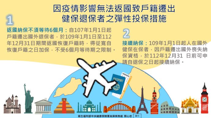 健保署高屏業務組林淑華組長表示,旅外國人因出境逾2年戶籍遷出導致健保退保者,可利用「全民健保權益保障因應措施」申請投保。另為使國人有充足時間返臺處理戶籍事宜,原訂於112年6月30日終止之措施,將主動延長至112年12月31日。如不同意延長投保,可填寫「疫情期間終止健保資格聲明書」終止健保資格,終止後將同時停止計收保險費及提供醫療服務。相關表件可於健保署全球資訊網查詢(路徑:健保署官網https://www.nhi.gov.tw首頁/重要政策/ COVID-19保費與就醫權益),請下載並填寫後郵寄或臨櫃辦理。民眾如有投保疑問,歡迎撥打健保署諮詢專線,市話請撥打0800-030-598或4128-678,手機請改撥(02)4128-678。