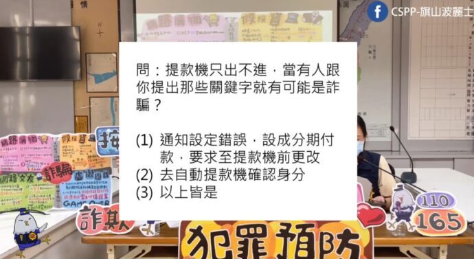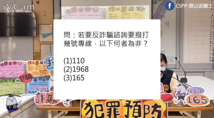 旗山分局警方表示,多數青少年都不知道犯罪後所要承擔的刑責,為提升暑假期間年輕學生防制犯罪及法律知識,警方特別透過線上直播有獎徵答活動,以輕鬆、趣味的互動方式將「識詐、反詐、防黑」等宣導主題帶入活動中,盼能讓青少年認識詐騙手法,保護自身之安全;全民反詐工作是持續性及深入性的工作,警方除針對詐騙集團查緝以及向上溯源刨除黑幫外,更要帶領民眾共同認識詐騙,唯有如此才能降低民眾遇害的可能性。