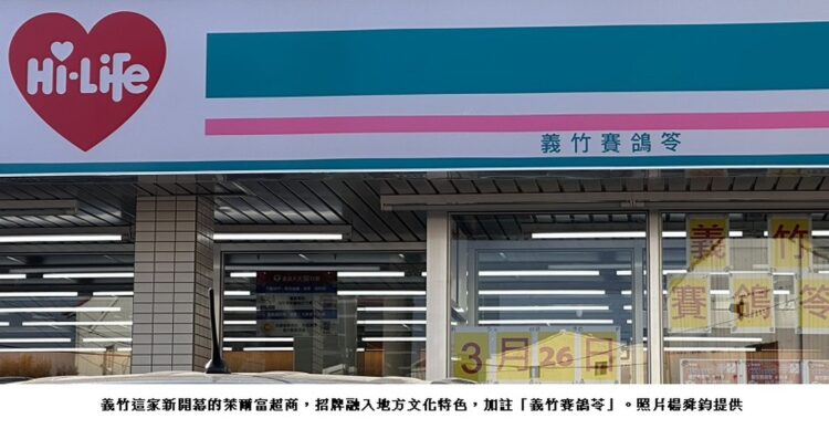 明天3月28日新開幕的這家萊爾富,也是位於台19線旁,就在義竹加油站附近,3月26日試營運,店家在招牌上加註「義竹賽鴿苓」之外,在門口的牆壁還張貼大型壁紙,解說義竹賽鴿苓的文化與歷史。