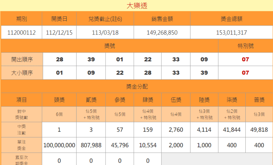 台彩15日晚間開出大樂透頭獎!本期第112000112期,獎號由小至大為:01、09、22、28、33、39,特別號:07;最終派彩結果出爐,頭獎一注獨得!獎金 100,000,000元,根據台彩官網公,開出頭獎的店家位在屏東縣潮州鎮新生路2之2號1樓的「富潤發彩券行」。