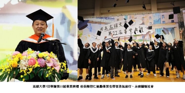 國立高雄大學今(7)日舉辦第22屆畢業典禮,校長陳啓仁勉以「帶著勇氣、責任與影響力,迎向未知的未來」,以及鼓勵畢業生「不一定是燈塔,但可以是一根火柴,為他人照亮一小段黑暗」,期許勇敢逐夢、永續關懷社會。