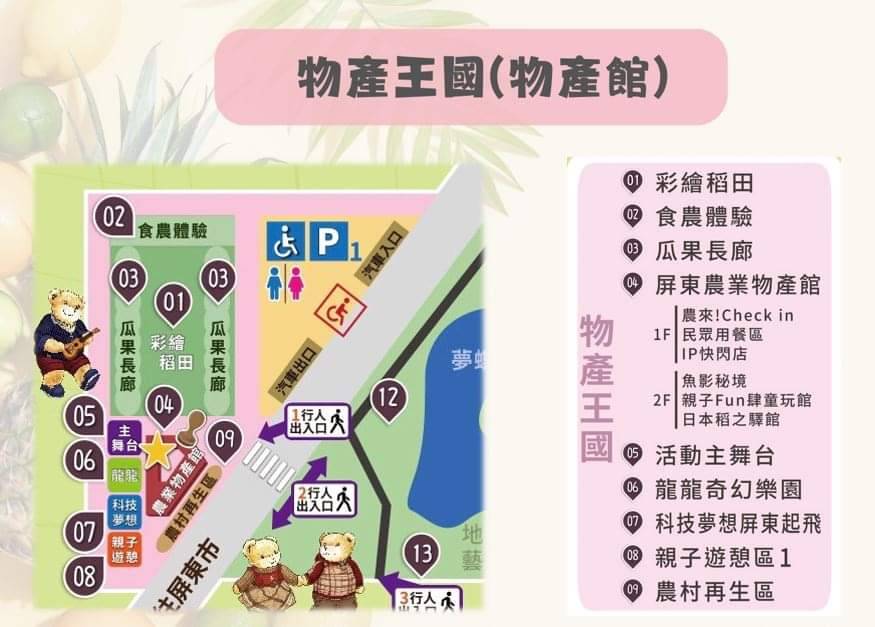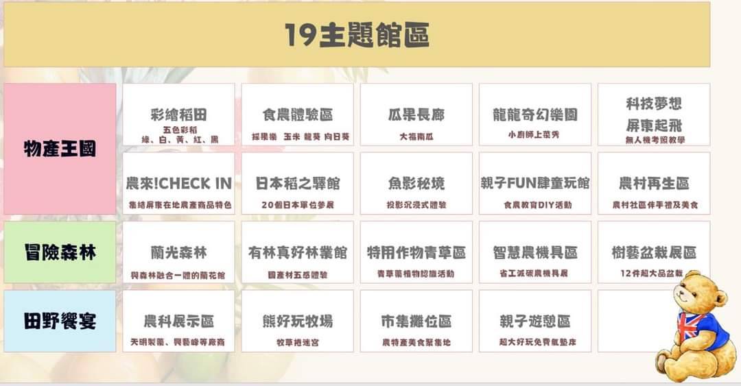 2024屏東熱帶農業博覽會內容相當豐富多元,展區以童話故事展開,涵蓋19個館區以「泰迪熊彩繪稻田」、「瓜果長廊」、「食農體驗」、「龍龍奇幻樂園」、「科技夢想屏東起飛」、「農來!CHECK IN」、「日本稻之驛館」、「魚影秘境」、「親子FUN肆童玩館」、「農村再生區」、「蘭光森林」、「有林真好林業館」、「特用作物青草區」、「智慧農機具區」、「樹藝盆栽青草區」、「熊好玩牧場」、「農科展示區」、「市集攤位區」、「親子遊憩區」命名並分佈於物產館(物產王國)、夢蝶湖(冒險森林)、豐和館(田野饗宴)等場區,預計再度掀起參觀熱潮。