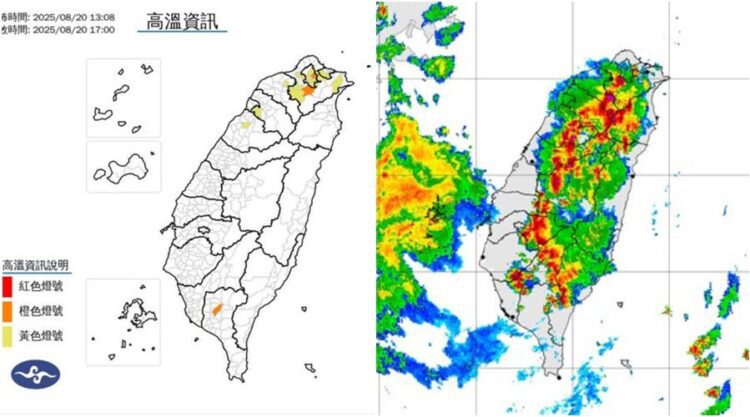 8月20日午後氣象署發出高溫警訊!白天臺北市有38度極端高溫出現的機率,新北市、屏東縣有連續3天出現36度高溫的機率,請加強注意。降雨方面,因對流雲系發展旺盛,日臺中以北、南投、嘉義以南地區及各地山區有局部大雨發生的機率,請注意雷擊、強陣風、溪水暴漲及冰雹,山區請慎防坍方及落石,低窪地區請慎防積水。