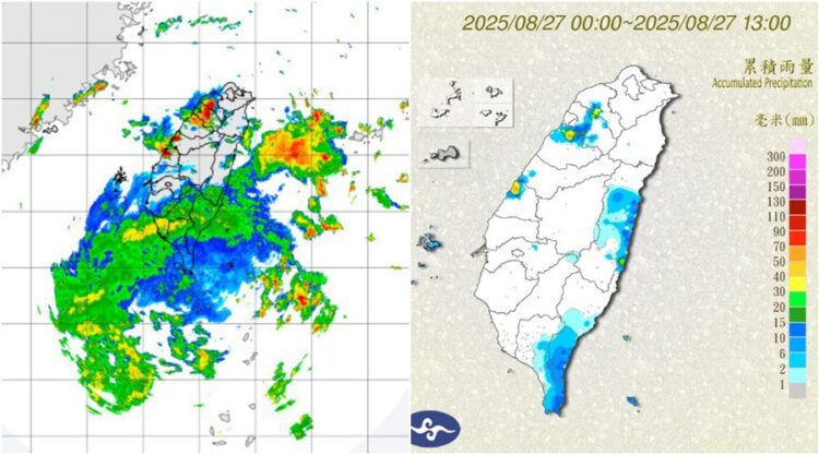 因對流雲系發展旺盛,8月27日中午氣象署發出大雨特報,桃園至雲林及南投,有局部大雨發生的機率,臺東及恆春半島亦有局部較大雨勢機率,請注意雷擊及強陣風,山區慎防坍方、落石及溪水暴漲,低窪地區防積水。