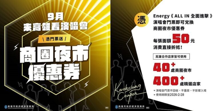 2025年下半年高雄演唱會熱潮依舊,不僅韓國大勢女團BLACKPINK、TWICE將於10月、11月相繼登場世運開唱,12月6、7日2025 Asia Artist Awards(AAA)頒獎典禮也將首度於高雄舉行,而本週末9月6、7日即將迎來台灣經典男團Energy《ALL IN 全面進擊》兩日登陸高雄巨蛋,為熱情歡迎數萬歌迷湧進高雄參加音樂盛事,高市府除延續憑指定演唱會票根兌換50元「商圈夜市優惠券」,各大百貨也響應演唱會經濟,推出一系列響應優惠活動,就是要為樂迷們打造最完整的追星體驗,一起在這座城市留下滿滿回憶。
