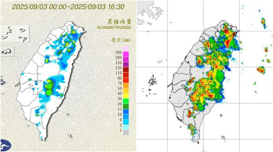對流雲系發展旺盛,易有短延時強降雨,氣象署今天9月3日16時19分發出大雨特報,苗栗以北、屏東、宜蘭地區及各地山區有局部大雨發生的機率,請注意雷擊及強陣風,山區慎防坍方及落石。