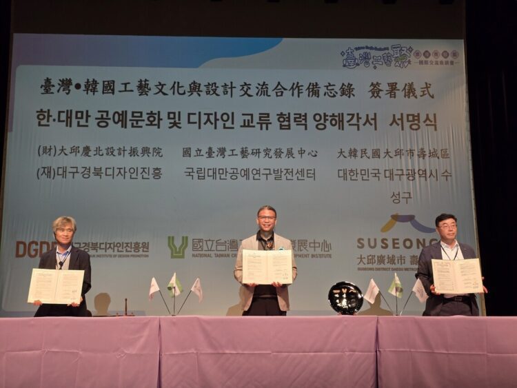 為深化國際工藝交流,強化臺韓友好合作,並推動臺灣與韓國工藝產業共榮發展,國立臺灣工藝研究發展中心(以下簡稱工藝中心)與韓國大邱壽城區政府及慶北設計振興院正式簽署「工藝文化與設計交流合作備忘錄」,盼透過工藝、設計、技術、研究、推廣等多面向合作,建立長期夥伴關係,並開啟雙方人員互訪、知識分享與展覽交流的新篇章。