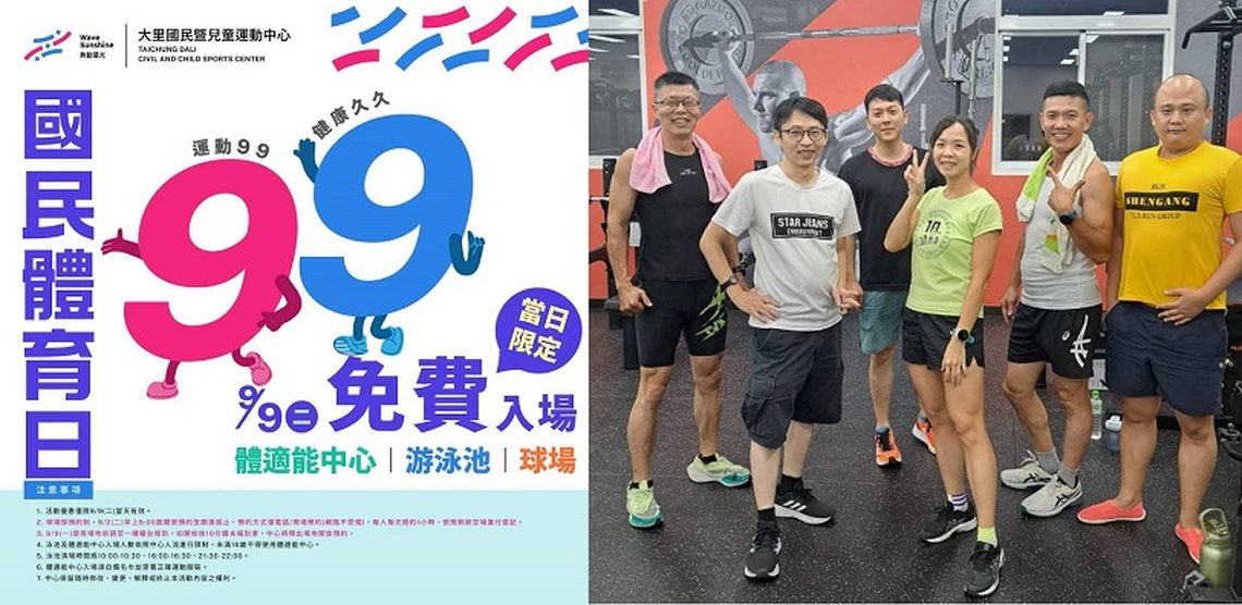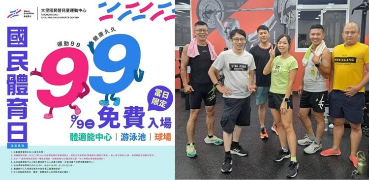 響應9月9日「國民體育日」,台中市政府推出「酷運動99 健康也99」系列活動。當天全市國民暨兒童運動中心、港區運動公園、公立游泳池及網球場全面免費開放,各運動中心也規劃專屬活動與優惠。同時,市府更攜手20座民營羽球館及4座游泳池祭出折扣與半價優惠,邀請市民朋友把握機會,一起動起來,迎向「健康久久」的生活。