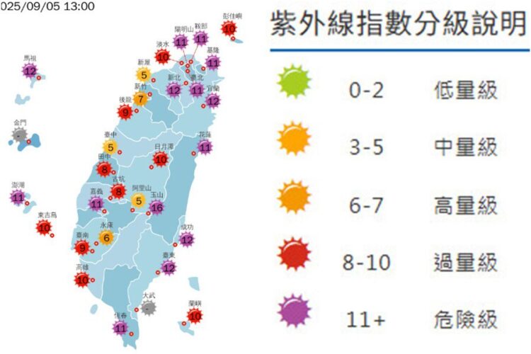 9月5日各地天氣高溫炎熱,氣象署中午發布高溫資訊,臺北市、新北市有38度極端高溫出現的機率,臺北內湖12時40分出現37.6度,新北三峽更於12時50分測得37.7度高溫;其他包括桃園、彰化、雲林、嘉義縣、臺南、高雄、屏東、臺東等縣市也有36度以上的黃色燈號,請注意。紫外線指數方面,有多處地方出現過量級和危險級,請做好防範措施。