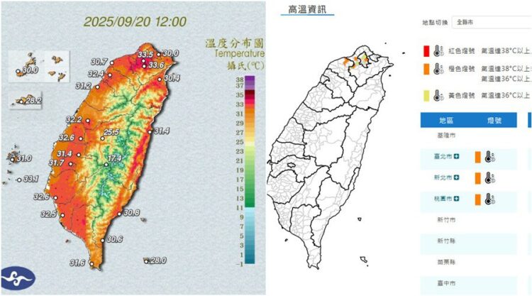 今天9月20日天氣持續炎熱,氣象署中午發佈高溫資訊,白天臺北市、新北市、桃園市有連續3天出現36度高溫的機率,昨天飆出39.4度的新北五股,今天上午11時10分已經出現37.1度的高溫,請相關地區民眾注意防曬、多補充水份、慎防熱傷害。
