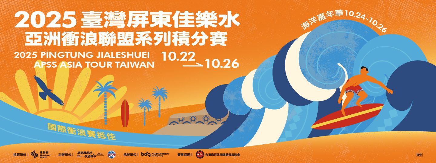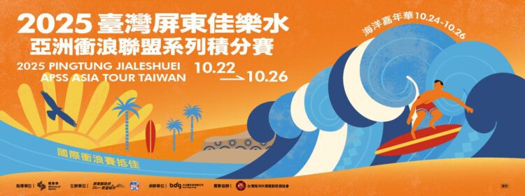 「2025臺灣屏東佳樂水亞洲衝浪聯盟系列積分賽」,除國際級衝浪積分賽事,更推出結合「海洋、友善、生態、文化、音樂、環保與水域運動等」多元的周邊亮點活動,包括衝浪體驗教室、海廢再生 DIY、寵物 SUP 趣味賽、變裝衝浪賽、在地市集與南島音樂表演,打造全民共享的「衝浪天堂」,邀請全台民眾與國際旅客一同前往屏東,共享浪潮、文化與海洋熱情,「Ride the Wave, See You in Pingtung!」。