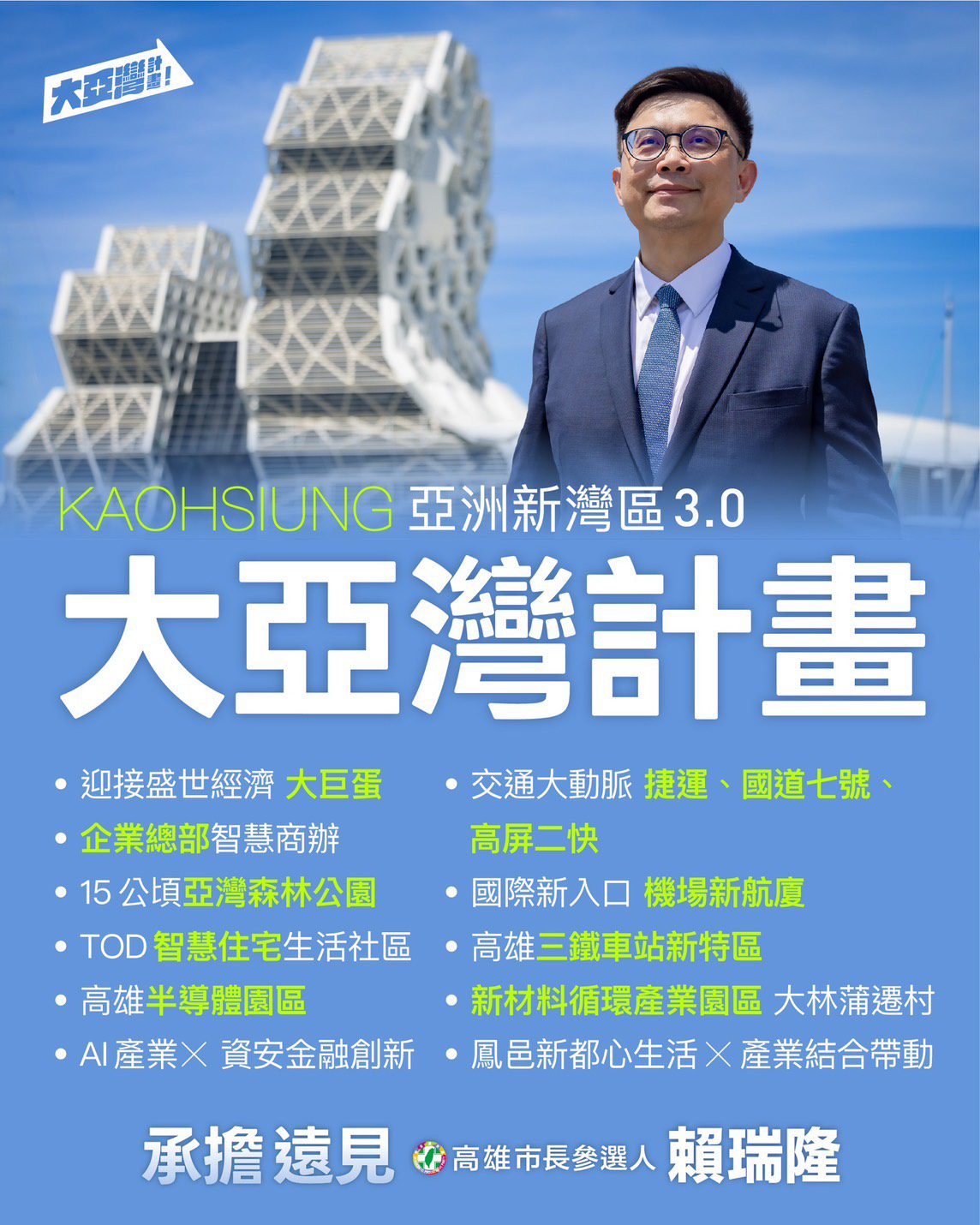 大亞灣計畫目的就是要打造高雄成為「宜居 x 宜業 x 宜遊」的城市新典範。高雄正處於產業轉型與國際鏈結的關鍵時刻,市民需要的不只是建設,而是能讓下一代安居樂業、產業持續升級的完整願景,我們會和大家創造下一個世代都可以美好生活的高雄。