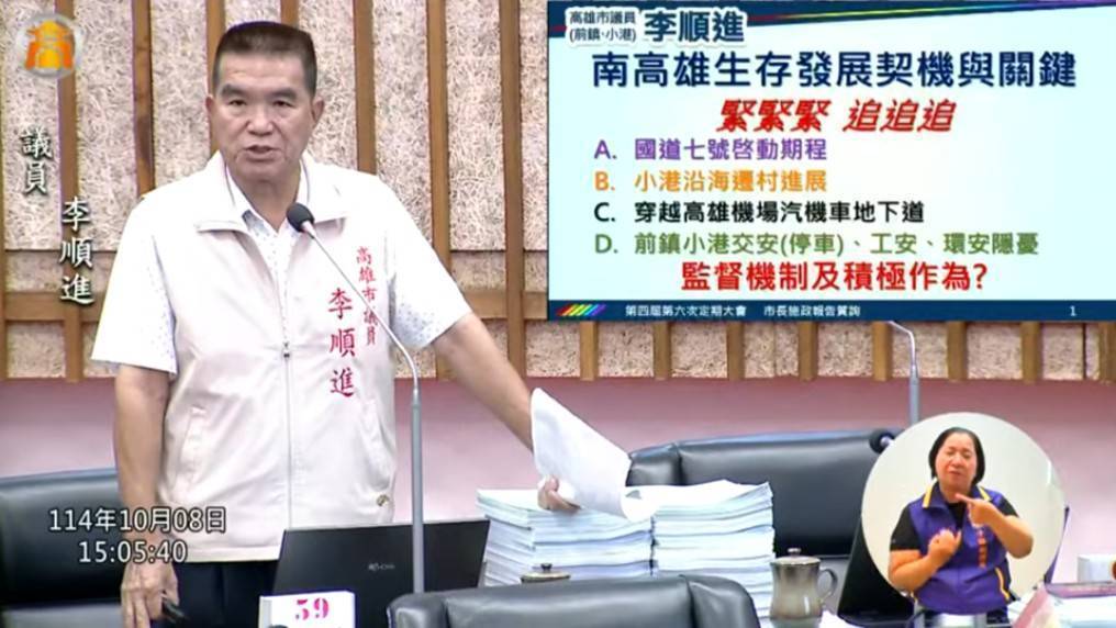 【記者范家豪/高雄報導】 高雄市議員李順進於8日市長施政質詢中,針對南高雄經濟發展契機與關鍵問題,關切國道7號施工期程、小港沿海遷村、前鎮及小港交安、公園建蓋地下停車場、興建穿越機場地下道等議題,除提出建言,並要求市府團隊盡速研議解決問題。