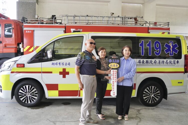 【記者范家豪/屏東報導】 屏東縣到院前救護再添新戰力!為強化地方緊急醫療能量,翔瑋有限公司第二代接班人董事長陳佳榆與家族成員陳義敏、蘇素卿,今(15)日於萬巒消防分隊捐贈一輛救護車予屏東縣政府,由縣長周春米代表受贈及致贈感謝狀,隨後,周縣長與第一線消防同仁召開座談會,傾聽基層需求,期盼共同提升縣內緊急救護服務品質。