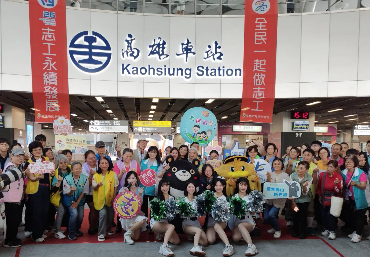 為迎接12月5日「國際志工日」,高雄市政府社會局今(17)日於高雄火車站下沉式廣場舉辦「閃出志願服務行動力」快閃活動,熱鬧開場為今年志工月揭開序幕。活動邀請吉祥物高雄熊、雞柳條以及啦啦隊熱力登場,隨著輕快曲目〈天下志工都是一樣的〉帶動全場氣氛,吸引眾多旅客駐足,共同感受志願服務的活力與溫度。