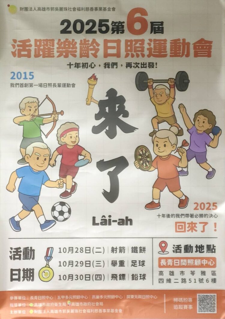 2025 年10月28日至30日,為期三天的「第六屆 活躍樂齡日照運動會」終於回歸日照日程。由 財團法人高雄市郭吳麗珠社會福利慈善事業基金會 精心策劃,邀請高雄市內多家日間照顧中心,包括長青日間照顧中心、五甲多元照顧中心、燕巢多元照顧中心,並跨縣市延伸至屏東市北興日間照顧中心,累計約500人次長者參與。基金會於民國100年成立以來即投入長者社區照顧服務,自民國104年12月首辦「日照銀髮運動會」,今年變更名稱為「活躍樂齡日照運動會」,主題訂為「來了」,象徵活動重啟亦代表長者對參與、被看見、被尊重的期待。這三日於日照中心之上午時段舉辦的競賽,不僅是體能比賽,更是友誼、生活、尊嚴的展現。