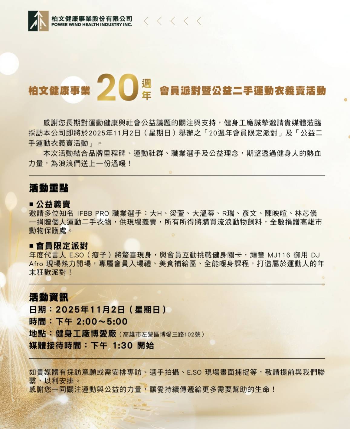 【記者 周志杰/高雄報導】柏文健康事業(8462)創立滿20週年,今年特別於高雄博愛廠舉辦會員限定年度派對,將「健身」與「公益」結合,發起「二手運動衣公益義賣」行動,邀請多位 IFBB PRO 健美職業選手、健身KOL及名模王麗雅共襄盛舉,捐出個人珍藏運動衣物提供義賣,所有義賣所得將全數用於採購寵物飼料,捐贈給高雄市動物保護處,為城市中的浪浪送上一份實際的溫飽。
