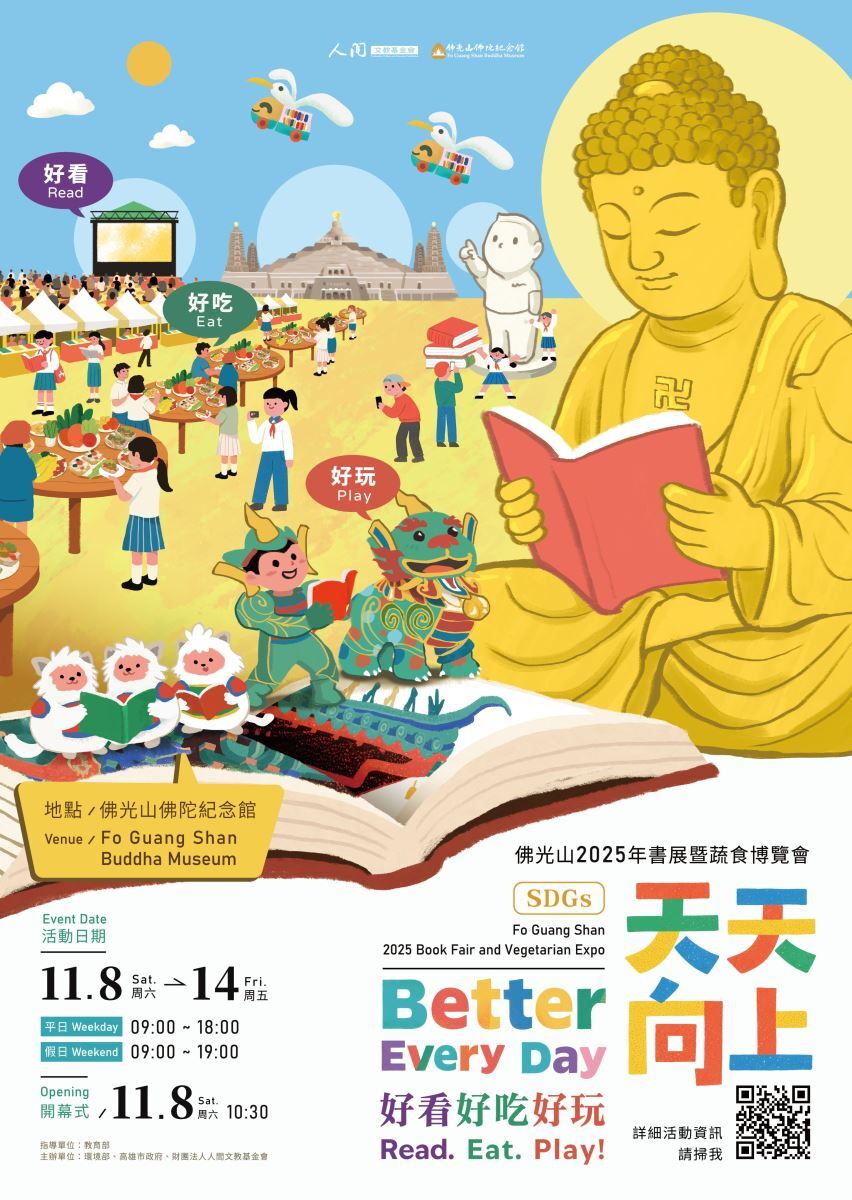 閱讀滋養‧慈心共善;深秋時節,佛光山佛陀紀念館即將迎來一年一度的重要文化盛事——「佛光山2025年書展暨蔬食博覽會」。由高雄市政府與財團法人人間文教基金會共同主辦,今年書展以「天天向上‧好看好吃好玩」為主題,不僅呼應國際「世界純素月」(World Vegan Month),更從閱讀、素食、永續生活等面向出發,引導大眾在日常中實踐慈悲與健康,走向一條身心靈共善的生活旅程。這不只是一場展覽,而是一個向下扎根、向內回返、向外擴散的文化行動。透過教育推廣、藝術體驗、綠生活示範、校園閱讀扎根與偏鄉捐書計畫,讓城市中每一個人,都能在知識的光亮之中,看見生活的美好、生命的方向。
