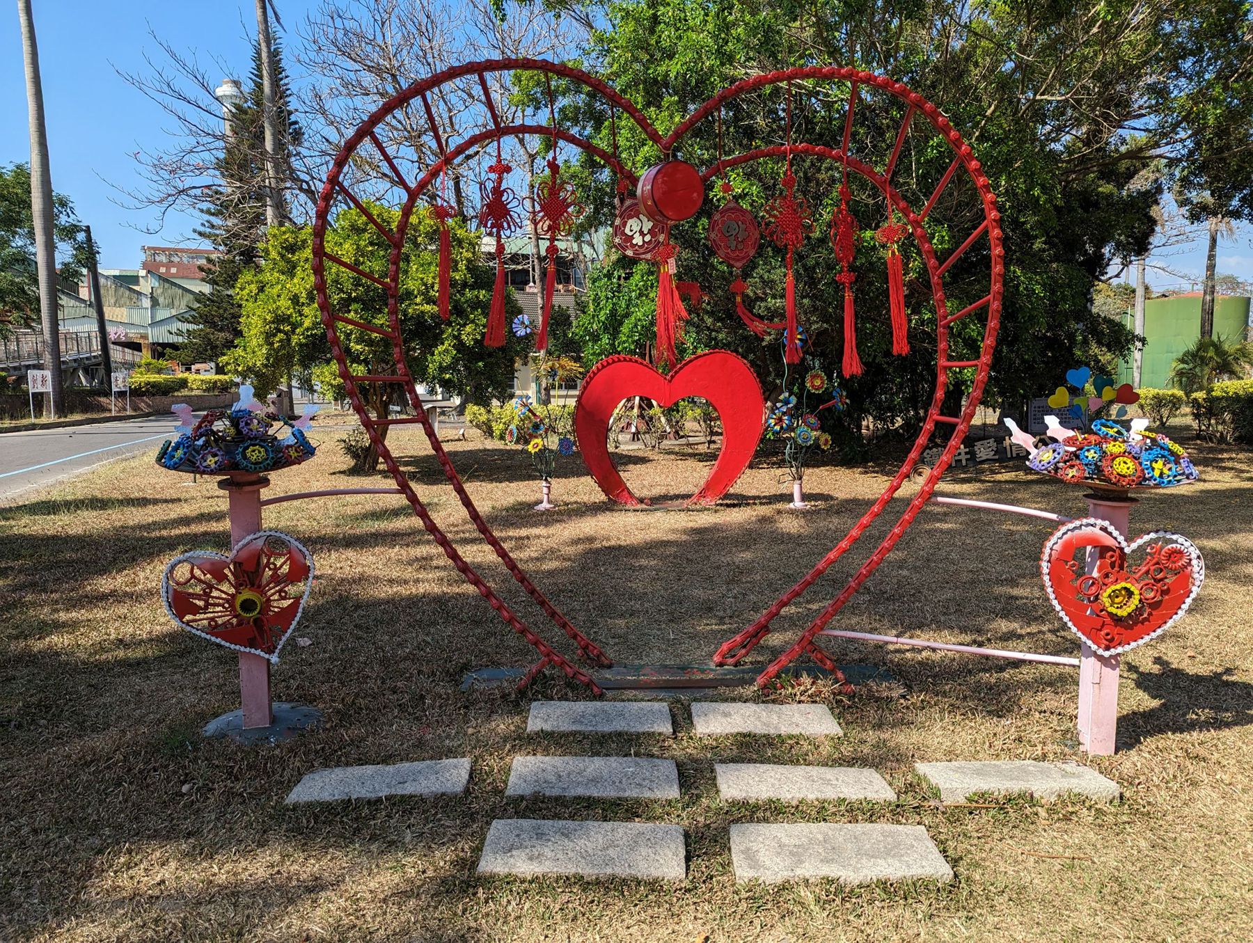 糖廠內的鐵件愛情公園也是情侶必遊之地,糖廠員工發揮美感與創意,打造出心心相印、相伴、福蝶綿綿、浪漫馬車、共傘、花前明月心等六件作品,近期更掛上春節掛飾,別有濃厚春節氣氛,而一旁鐵園迷城,有著紅、白、粉、黃色的九重葛花,現正開滿是取景拍攝的最佳時期,九重葛花迎風搖曳浪漫英姿,吸引大、小朋友悠遊其中。