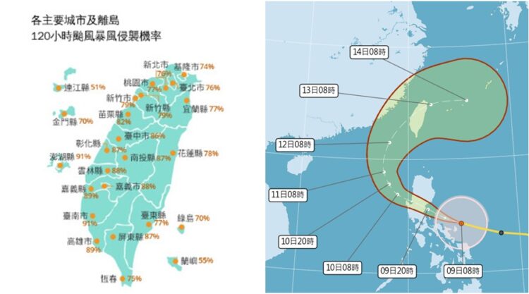 9日上午至10日晚上,因颱風外圍環流及東北風偏強,苗栗、臺中、彰化、屏東、澎湖等縣市局部地區,有平均風9級以上或陣風11級以上發生的機率,基隆、雙北、桃園、雲林、臺南、宜蘭、臺東、金門、連江等縣市,以及嘉義縣、新竹縣市局部地區有平均風6級以上或陣風8級以上發生的機率,請注意防範。