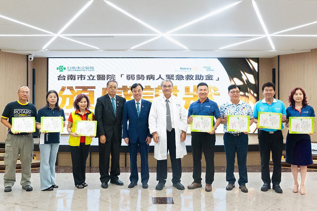 台南市立醫院院長蔡良敏感謝各扶輪社及學會的慷慨捐助,並承諾這筆款項將專款專用,作為弱勢病患的醫療補助。他指出,這筆基金的運作將如同生命線,讓醫療團隊能在最需要的時刻伸出援手。蔡良敏院長也特別提到,台南大員扶輪社社長楊政憲的父親,正是他在大內地區巡迴醫療時照護的病人,如今楊社長與各社友的愛心捐款回饋社會,更讓他深感溫暖與欣慰。