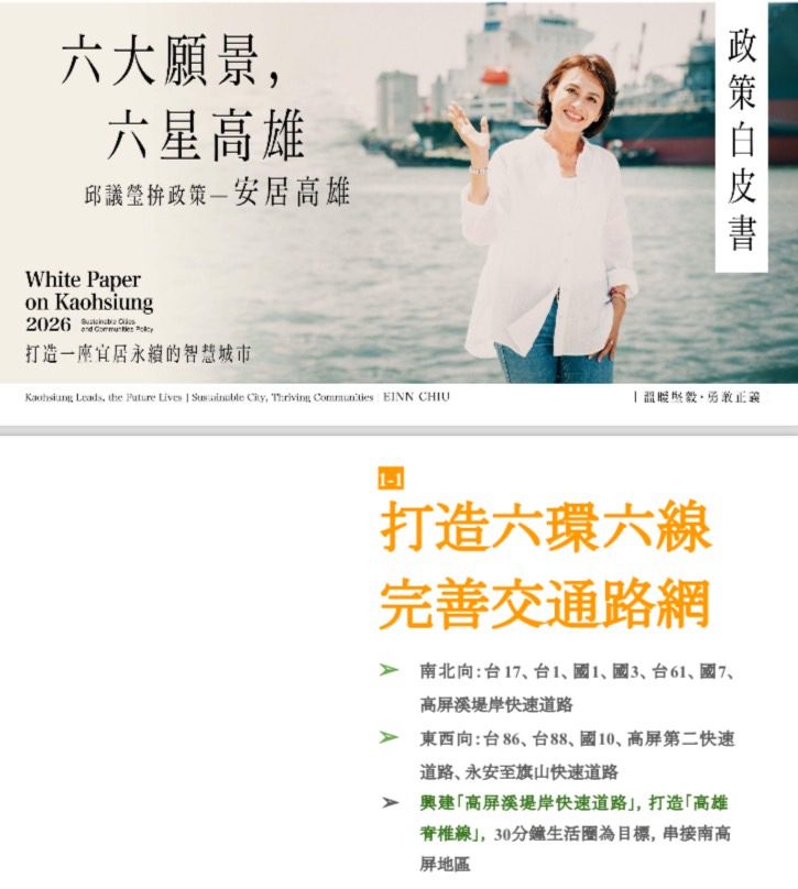 邱議瑩進一步說,其中最重要的新幹道,是沿高屏溪興建堤岸快速道路,北自旗山、美濃一帶,串連台86線、台88線、國道10號和高屏第二快速道路等東西向幹道,往南銜接未來的南星新機場,成為「高雄脊椎線」,並比照日本三大都會圈及法國大巴黎都會圈,進一步與台南沙崙科學園區及屏東科技園區做連結,形成「南台灣都會圈」。