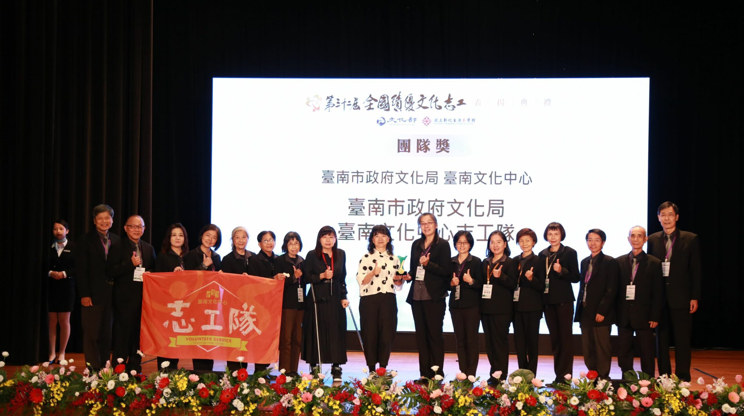 【記者郭忠淵/台南報導】 臺南文化中心志工隊今年參加文化部所舉辦的「第32屆全國績優文化志工表揚獎勵活動」榮獲團隊獎,這是文化類志 工最高榮譽,在全國文化社教單位中遴選5個績優團體,臺南文化中心志工隊繼106年獲獎後,再次獲得文化部評審委員的肯定。文化部於(14)日在公務人力發展學院福華國際文教會館隆重舉行表揚典禮,獎勵全國績優文化志工。