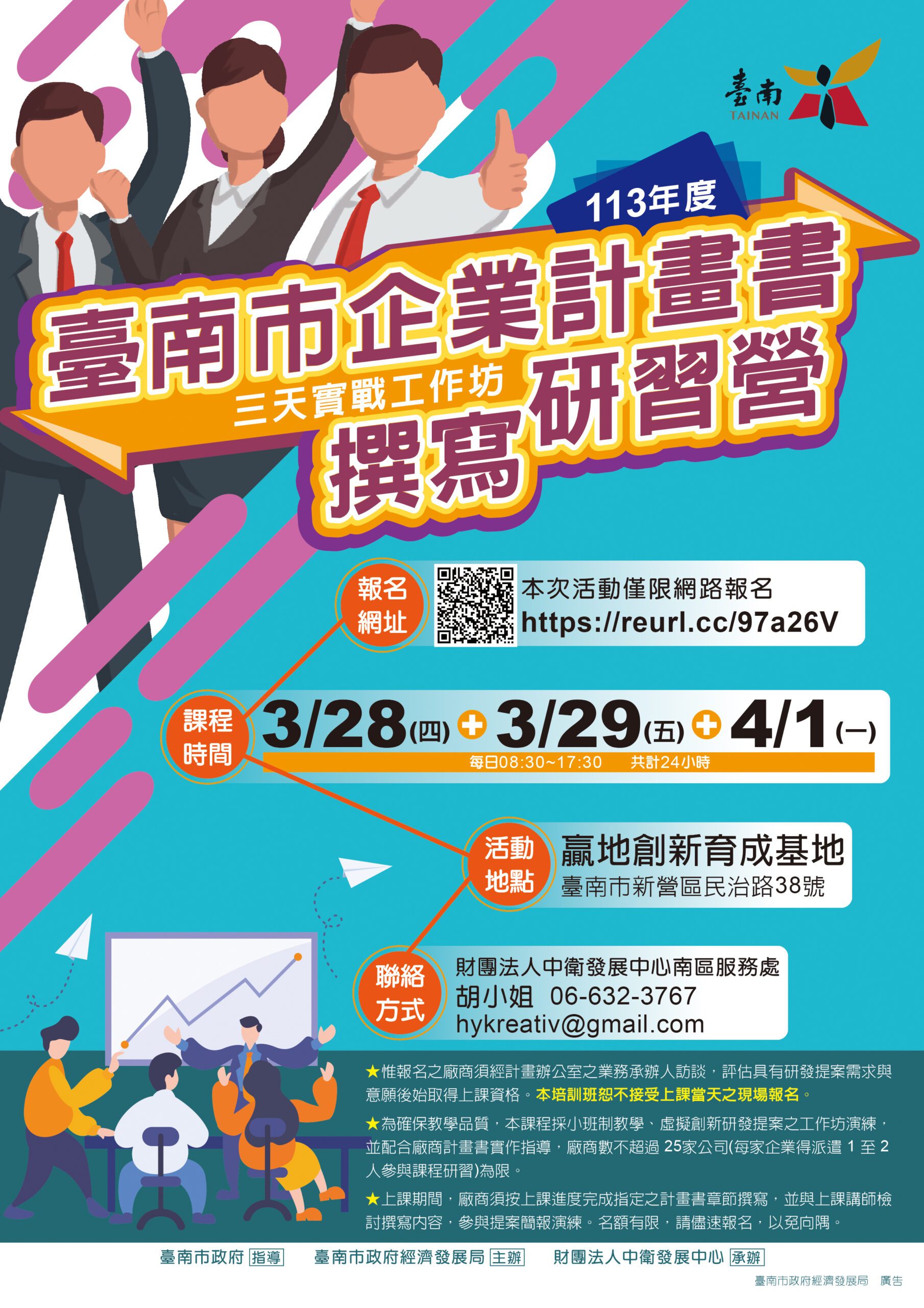 臺南市政府府經發局將於在113年3月28日、29日及4月1日舉辦為期三天的「企業計畫書撰寫研習營」,由各領域專家親身帶領參加者撰寫計畫書及實地演練,協助中小企業克服計畫書撰寫的挑戰,歡迎台南市有志創業者踴躍參加,讓創業夢想更往前邁進一步。