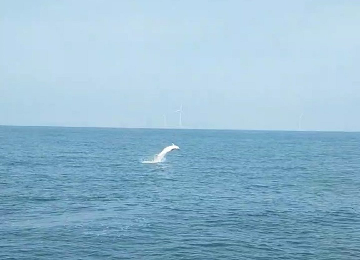 【記者范家豪/高雄報導】 海洋委員會表示,今22日上午海洋保育署收到來自苗栗、彰化,以及嘉義三地的白海豚巡護艦隊船長夥伴回報,在北(苗栗竹南海洋風場外)、中(彰化漢寶濕地外海)、南(嘉義布袋外海)看到三群至少七隻白海豚及其中一隻白海豚跳躍的身影,漁民們一看到白海豚就趕緊停船紀錄,避免打擾到野生動物,也讓大家有機會看到如此清晰的影像,心情跟著雀躍。