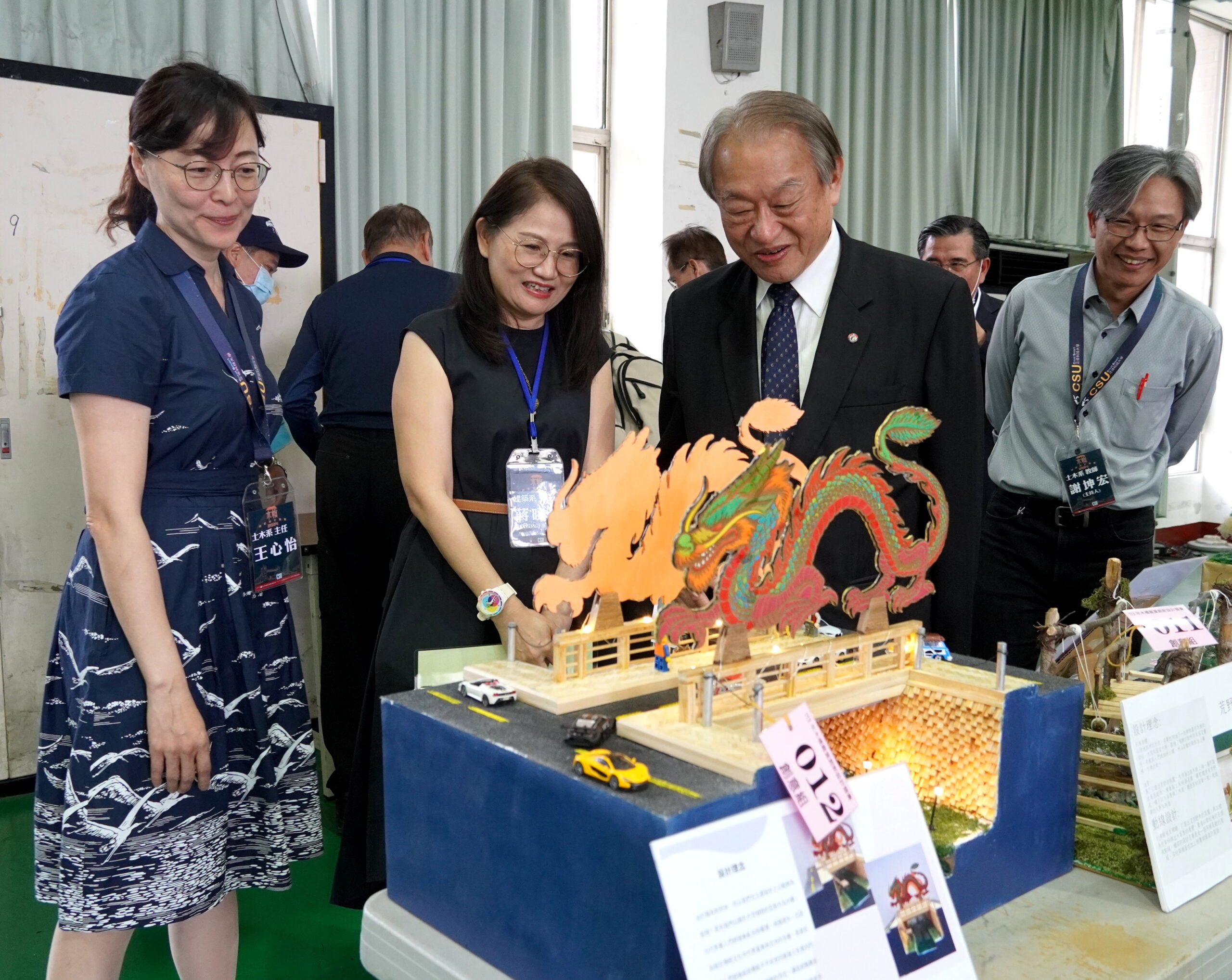 現場並展示有來自全國各職校學生別具巧思的橋樑造型,校長龔瑞璋、教務長龔瑞維、土木系主任王心怡及建築系主任蔣曉梅一一前往展示區觀看,對於同學的獨特創意表示肯定。