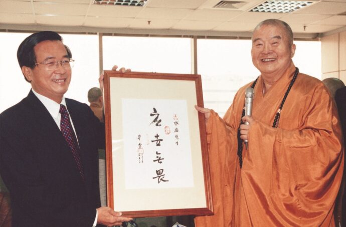 陳水扁下午由2名隨行人士陪同下,在大師靈前祭拜,慧傳法師向大師報告,「阿扁總統來祭拜,當時大師您送他『應世無畏』四個字,今天陳總統特別來上香。」