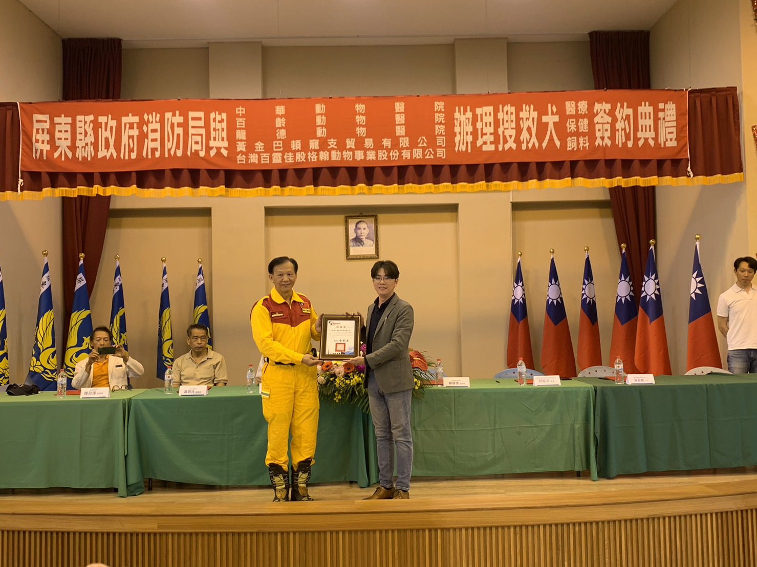 屏縣府消防局於113年4月8日10時30分,在消防局5樓禮堂,由屏東縣獸醫師公會前理事長郭永裕及與會貴賓見證下,縣府消防局與台灣百靈佳殷格翰動物事業股份有限公司、黃金巴頓寵支貿易有限公司及中華、百齡、龍德三家動物醫院完成簽約典禮儀式。