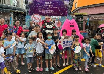 記者李至文/高雄報導 臺灣科學節IP角色「奇奇」與高雄市的官方觀光吉祥物「高雄熊」,9月14日在高雄後驛商圈的彩繪傘活動現場,與大小朋友們親密互動,現場小朋友興奮排隊合照。此次活動為國立科學工藝博物館(科工館)即將舉辦的「2024年第五屆臺...