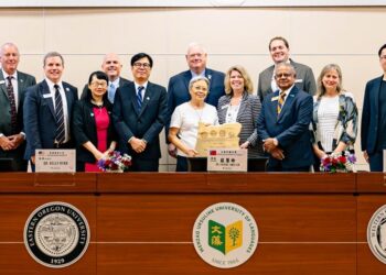 記者李至文/高雄報導 文藻外語大學積極拓展台美學術交流,今(15)日與美國西奧勒岡大學、東奧勒岡大學、南奧勒岡大學及奧勒岡理工大學共同簽署姊妹校合作備忘錄,而高雄市長陳其邁也親臨現場觀禮。未來雙方將在師生互訪、學生交換、研習及華語教學等項目...